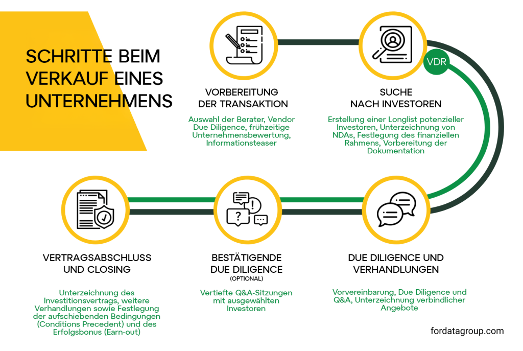 Für jedes Unternehmen wird – abhängig von der Situation der Gesellschaft und den Erwartungen der Eigentümer – ein individueller Due-Diligence-Prozess durchgeführt. Je nach Art der Transaktion kann er zwar etwas unterschiedlich aussehen, doch seine grundlegenden Prinzipien und Mechanismen bleiben in jedem Fall gleich. In einer typischen Verkaufstransaktion durchläuft ein Unternehmen in der Regel vier Phasen: Vorbereitung der Transaktion, Suche nach Investoren, eigentliche Due Diligence und Verhandlungen sowie schließlich die Vertragsunterzeichnung und der Abschluss (Closing). Mehr zu diesem Thema lesen Sie in unserem Beitrag „Due Diligence Phasen – Ihr Unternehmensverkauf Schritt für Schritt“.